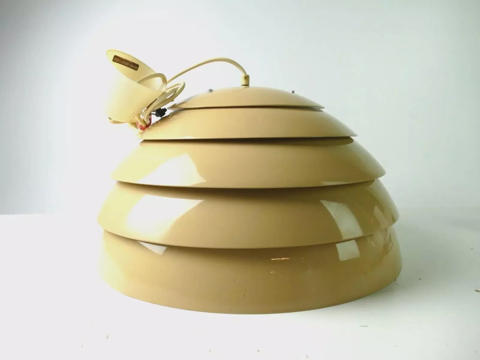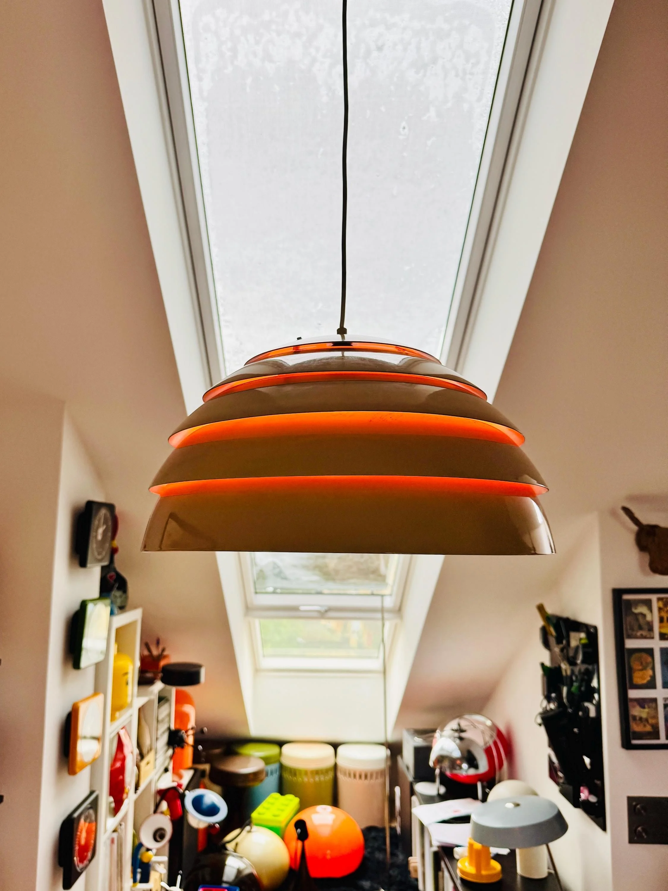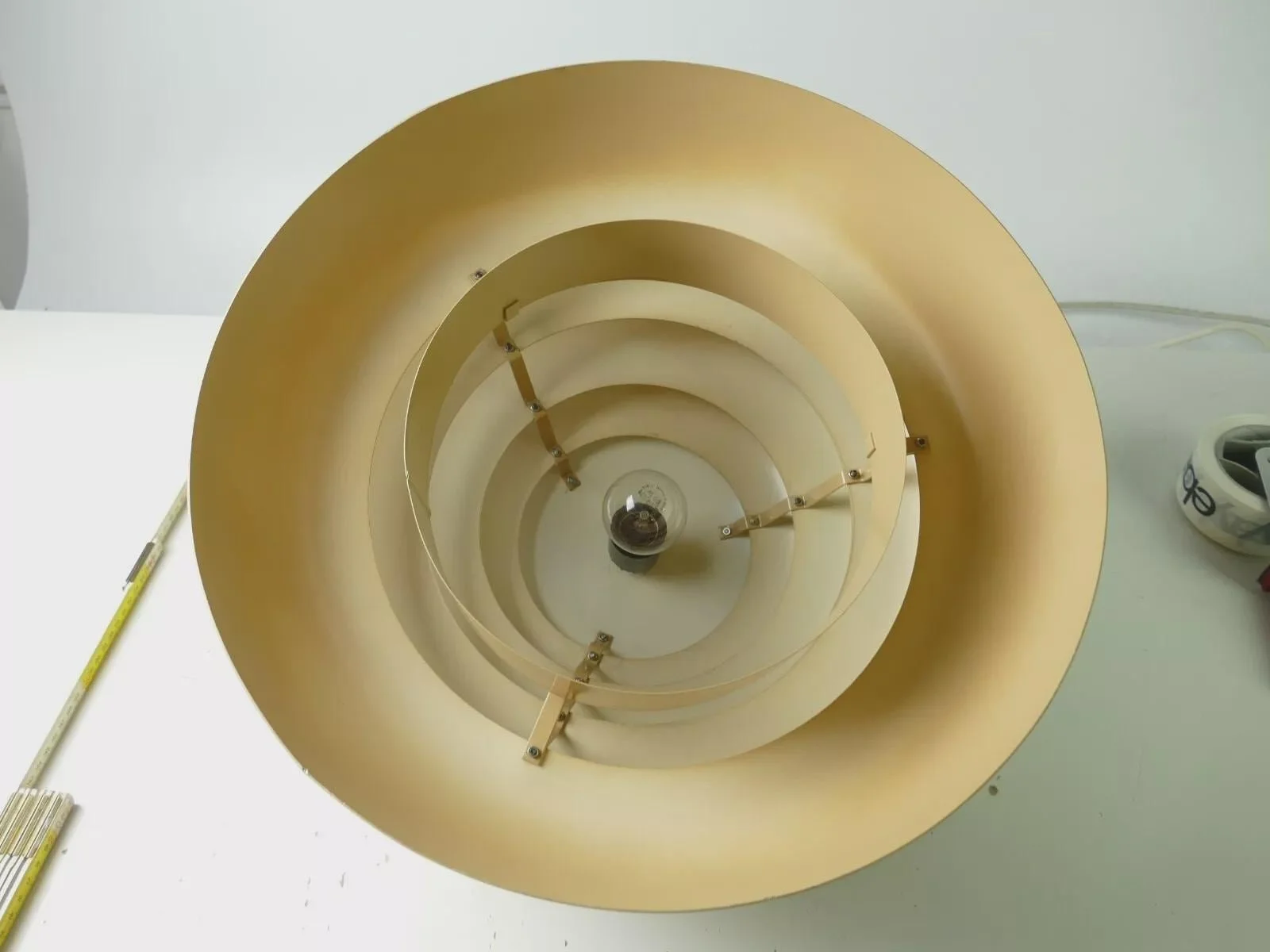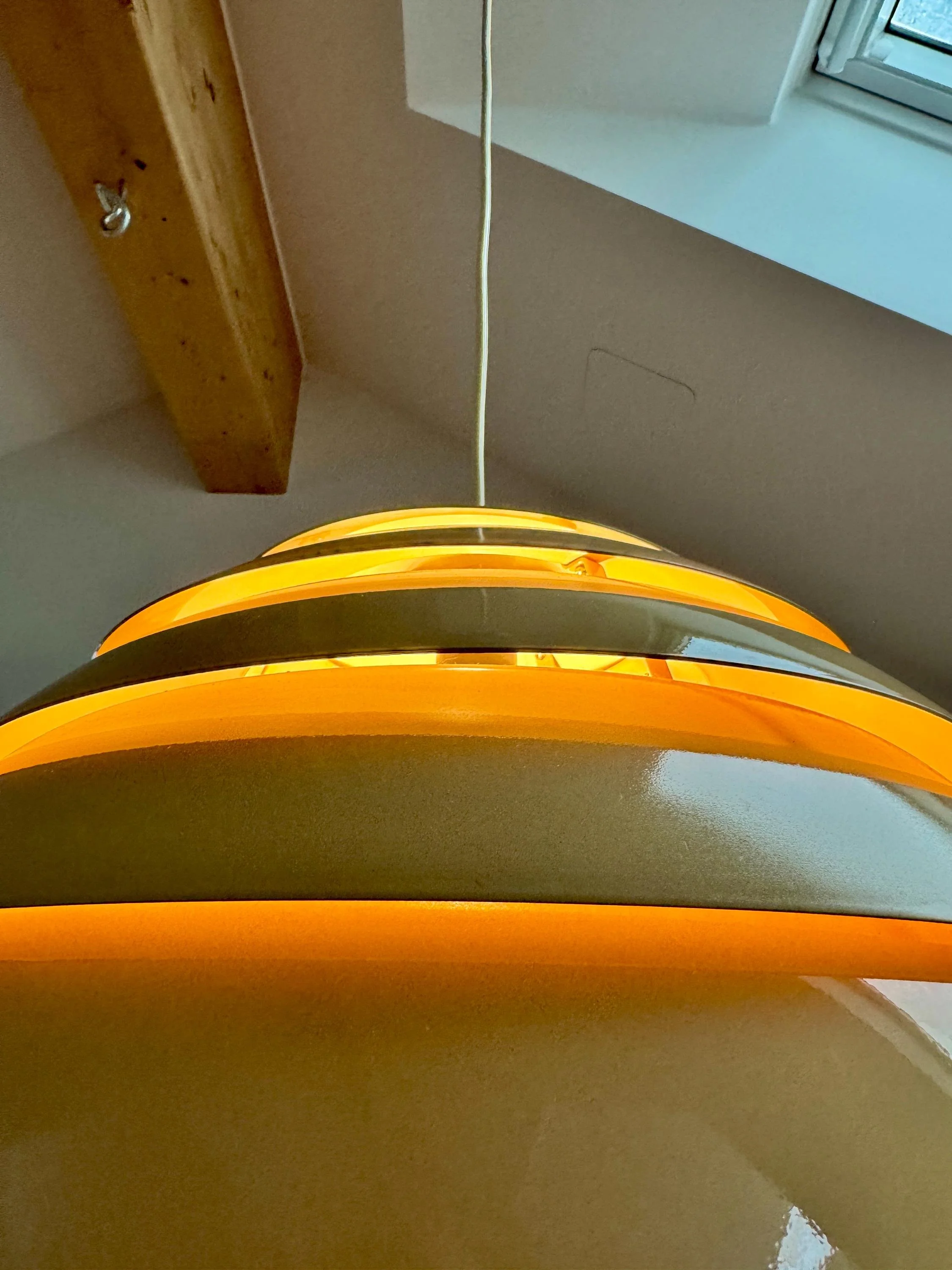 This rare model is composed of multiple aluminium rings that create a unique architectural presence. The clever construction results in a soft, glare-free glow, a signature of Jakobsson’s lighting philosophy. Perfect for dining rooms, living spaces, or collectors of original Scandinavian design.